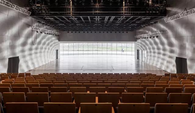小劇場的特色之處在于,內部采用隔音玻璃制成一片巨大的幕墻,客人可以通過全景窗口來欣賞外景,與戶外的無縫連接宛如以自然為背景。而兩側的肌理墻,則完美地用光影模擬了水波紋的擴散,不規則的墻壁紋理與光線、陰影相互作用,創造出富有戲劇感或意境的影像。