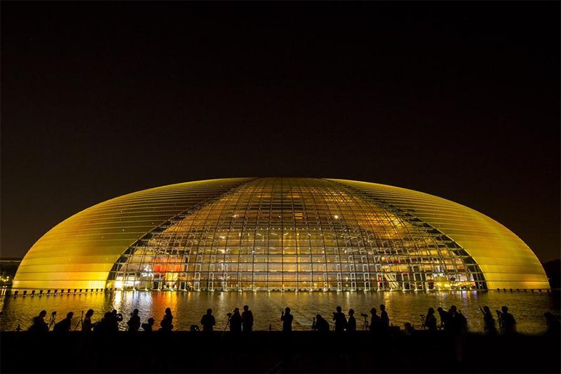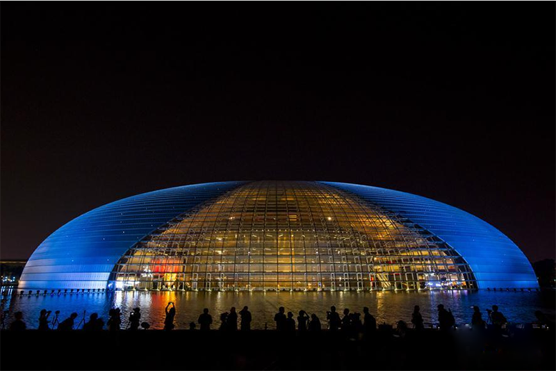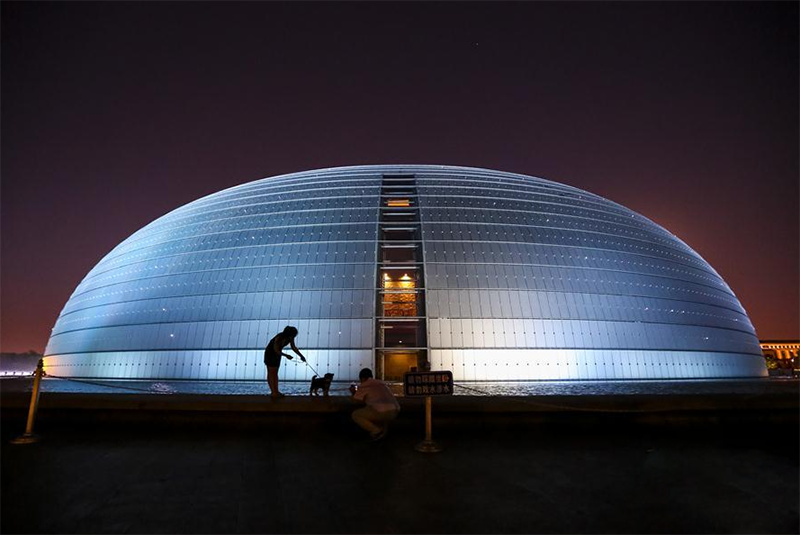 華燈初上,姹紫嫣紅。5月11日19時30分,隨著北京市夜景照明按照重大節日等級準時開啟,北京的夜空被數以百萬計的五彩斑斕的夜燈點亮。國家大劇院外,近2300平方米的草地上布滿各種小噴泉造型的光纖燈管,北門臺階的10860套蘆葦燈配合著大劇院弧形外形和四周噴泉,輪番展現七色光譜,如夢如幻。