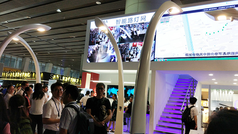 在展館內,小編見到了不少企業擺出了智慧路燈,抬頭一看,路燈桿集成了LED燈具、Wifi熱點、攝像頭、一鍵報警、LED公告屏、充電樁等硬件設備,并使燈具搖身一變成了智慧城市建設中一體化的感知載體。