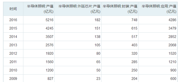 ? 數據顯示,2016年我國半導體照明產值達5216億元,外延芯片產值182億元,封裝產值748億元,應用產值4286億元。