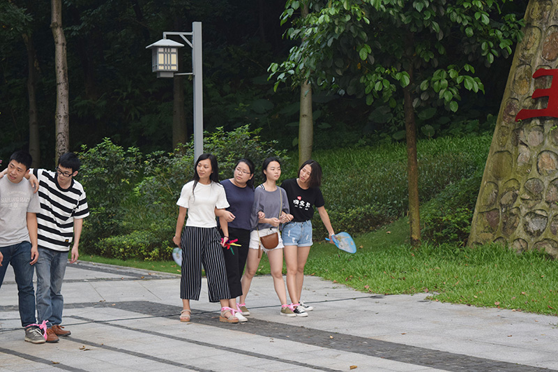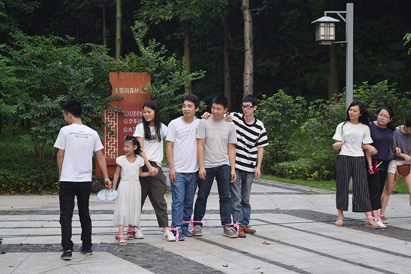 終極環節——齊心協力:每隊的成員站在起跑線上,將相鄰隊員的左右腿綁在一起(綁在踝關節附近),聽到發令后一起跑向終點,先到達終點為勝(勝出一隊可以決定下一個游戲的比賽順序),終環節由紅隊獲勝,獲得大禮品一份。