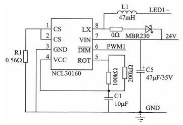 ? 根據(jù)NCL30160的數(shù)據(jù)手冊及輸出要求計算外圍器件參數(shù)。系統(tǒng)采用5顆1 W的LED串聯(lián),恒定電流為350 mA。