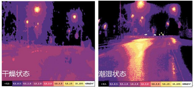 圖4、常規照明下某道路同一位置干燥狀態和潮濕狀態時候的照明亮度對比
