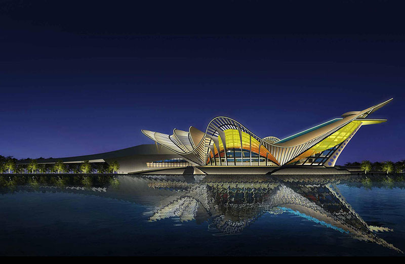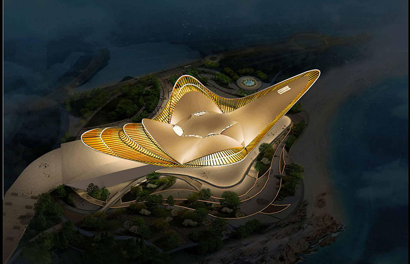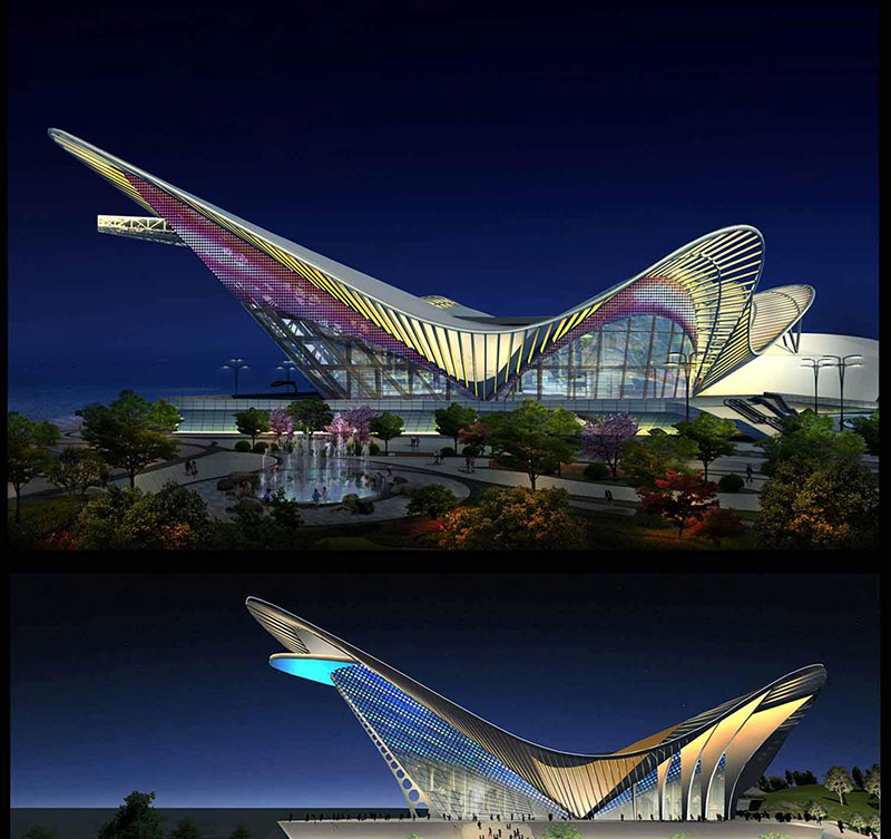 工程建筑面積31313平方米,其中地上8層,建筑高度66米。首層為設(shè)備用房及服務(wù)用房,層高6米。“鳳凰”的頭頸部匯集餐飲服務(wù),在距地面52米處為設(shè)立蹦極平臺;腹部開放綜合餐飲和娛樂大廳;背部為可供游客游覽的綜合廣場;尾部規(guī)劃為可容納1200人的國際一流歌劇院。